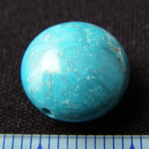 | 価格:380円/1個 形状:ボタン(丸の中心がふくらんでおります。) サイズ:直径約12mm×厚さ最大約6mm 穴:石のほぼ中心を貫通しています(写真参照) 色目は個々の石によってばらつきがございますが、比較的濃い目の水色が多く、緑がかったものもございます。 部分的に茶色や黒がございます。 穴の大きさ:約0.8mm ※インクルージョン(内包物)がございます。 |